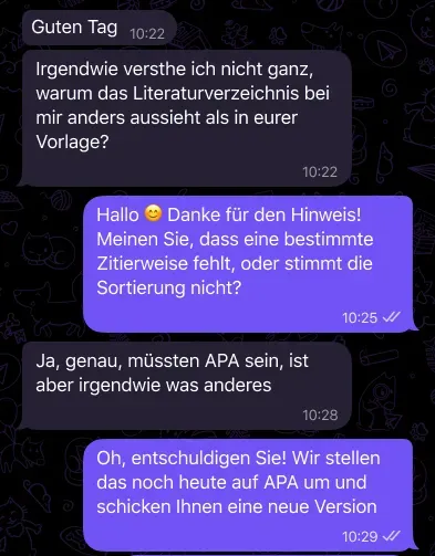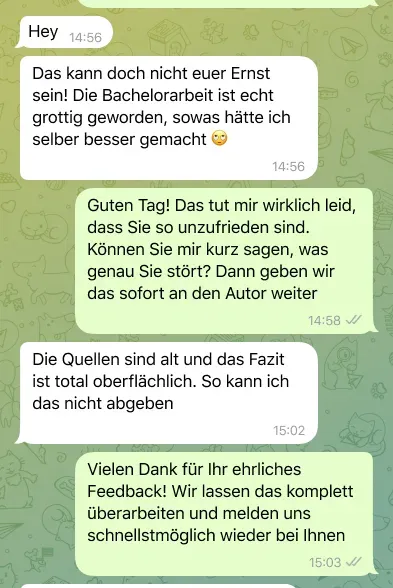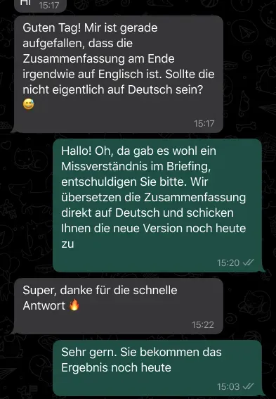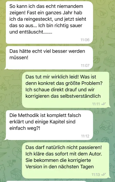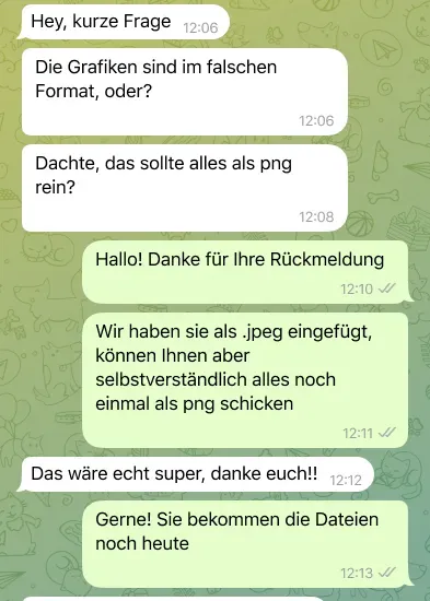 Für uns ist es besonders wichtig, dass jeder Kunde mit dem Ergebnis vollständig zufrieden ist und genau das erhält, was er erwartet hat. Deshalb reagieren wir aufmerksam auf jedes Feedback und bemühen uns, mögliche Probleme sofort zu lösen. Auf dieser Seite zeigen wir reale Beispiele dafür, wie wir mit Einwänden und Rückmeldungen umgehen – offen, ehrlich und mit größter Sorgfalt für unsere Kunden.