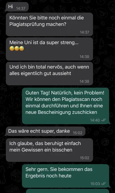 Wir schätzen jede Kundin und jeden Kunden. Deshalb ist es für uns besonders wichtig, dass Sie mit dem Ergebnis vollständig zufrieden sind. Zudem hilft uns jedes Ihrer Feedbacks, besser zu werden und einen noch hochwertigeren Ghostwriting-Service anzubieten.